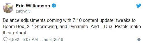 堡垒之夜官方公布V7.10#3将在1月8日晚上9点进行更新,本次版本将添加新武器,以及对之前武器平衡进行调整,详细情况请看下文!