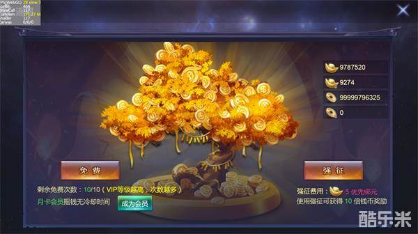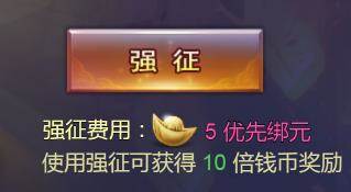 c、除了通过免费摇钱之外,还可通过消耗绑定元宝进行强征获得金币,使用强征可获得10倍钱币奖励。