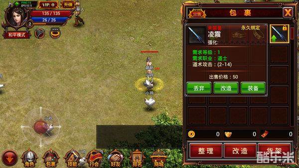 发觉怪物很难战胜,请点击左下角的红色箭头按钮就能打开常用的功能面版。在这里可以换上新的装备,助你更快打怪!
