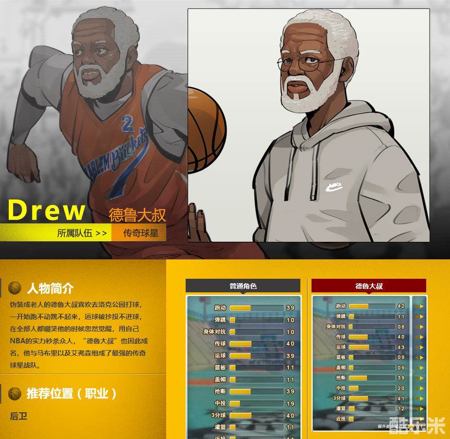 身高1米91的德鲁大叔将成为《街头篮球》中身高最高的后卫,整体能力相当强大,德鲁大叔就像看到了几十年之后的我们,虽然技术可能比他差了很多,但只要这股“不服老,不放弃”的信念在,我们每个人都可以成为“德鲁大叔”。赶快到球场上来体验《街头篮球》史诗级后卫德鲁大叔吧!自由就是唯一的规则!
