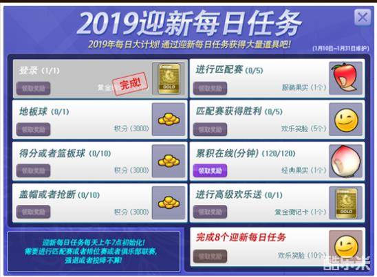 1月10日服务器维护后,2019迎新任务正式开启,玩家只需要登录、获得地板球、得分、盖帽或者抢断,进行匹配赛、排位赛、俱乐部联赛来完成任务。迎新每日任务上午7点初始化。