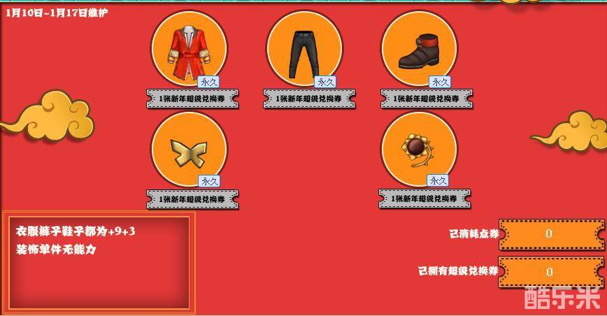 新年新增了三种不同宝箱,包含大量稀有道具、能力道具、新套装、经验、徽记卡、31级角色包等道具。其中更是增加了全新的特殊套装的兑换。新年狂欢宝箱单价:490点券,金色新年宝箱通过新年狂欢宝箱打开获得,金色新年钥匙单价:2200点券,可以用于打开金色新年宝箱。