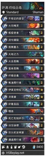 该卡组是铺场嗜血异变萨,属于中速卡组。前期依靠火羽精灵、火舌图腾、蛮鱼图腾进行占场生物交换,从而获得场面优势,并减费通道爬行者,配合不稳定的异变强化场面,最终再靠嗜血完成收尾斩杀。