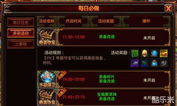 在《王者之路》里打开“每日必做—多彩活动”下的奇袭夺宝活动中击杀副本怪物可获得大量材料、道具奖励。更重要的是,该地图属于PK区域,所以要千万小心,以防其他玩家偷袭夺取你的宝物哦!