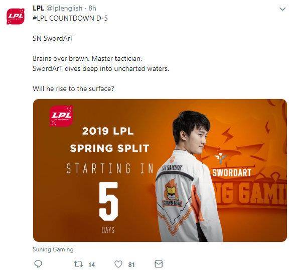 今日,距离1月14日LPL春季赛开赛还有5天,LPL官方推特发布了倒计时系列海报,今天的主人公是新加入SN战队的SwordArT,他此前效力于LMS赛区的FW战队。