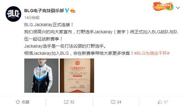 英雄联盟BLG官宣新打野:Jackairay已正式连接