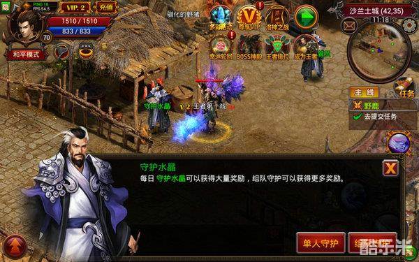 玩家可以通过游戏界面上方的“每日必做”按钮,选择立即前往守护水晶活动,或直接来到沙兰城(42,35)坐标附近与守护水晶Npc对话,选择“单人守护”按钮开启活动。