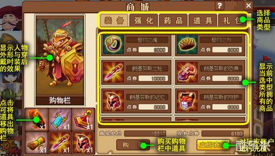 商城中最重要的区域,所有的商城道具都可以在这里找到!你可以点击进行购买将商品放入购物栏中,或者将商品赠送给他人。