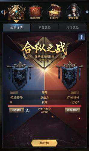 每个主公的营地出现时,会根据当时战力绑定一个初始积分,进攻其他主公的营地可以夺取悬赏积分,夺取的积分会加到自己阵营的阵营积分上,同时会增加其20%的积分到自身的悬赏积分上。在战斗时间内,攻破对方营地即可获得对应积分,活动结束时积分多的一方获胜,如果其中一个阵营获取对方积分达到总积分40%,活动将提前结束。合纵之战作为一个要塞攻防战,援防、进攻都只能在营地中进行。而且,即使是同盟,只要处在敌对阵营,都不能参与集结和援防。