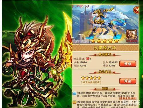 “万里腾云驹”的技能有着强力的恢复辅助能力,在对敌军造成伤害的同时,它可将伤害值的一部分转化为血量,为我方血量低的武将进行治疗。五星后可达15%的转化量,有了强大奶量的保驾护航,少年们上阵杀敌更可义无反顾。