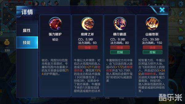在前期对线时,牛魔的三技能不仅可以在敌方打野进行线上GANK时有效的保护队友,更可以释放三技能先手击飞敌方,配合我方打野的线上GANK,快速积累对线优势。后期团战时,牛魔释放二技能突进后释放三技能先手开团,可以击飞尽可能多的敌方,使得队友可以安稳输出,此外三技能可以有效地分割战场或切断敌方的退路,方便队友进行后续的输出伤害从而完成收割。