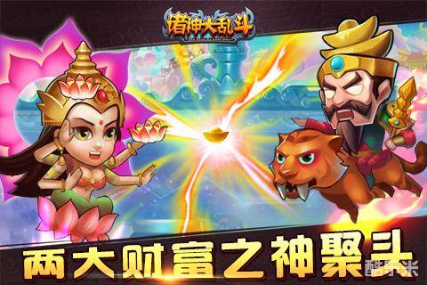 在《诸神大乱斗》中,财神头上顶着一个大元宝,手中也拿着一个金元宝,身下骑着黄澄澄的大老虎,一副气派的样子。财神有三个普通攻击技能,分别是撒钱、元宝压顶、元宝护盾攻击,另外还有一个名为元宝雨特殊技能,使用此招时会向对方阵营施放5波元宝雨,对敌方全体造成5波伤害。