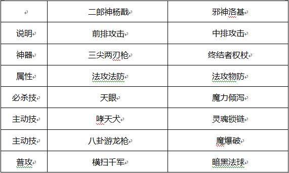 在《诸神大乱斗》中,二郎神头戴蓝缨翎,身着威武的铠甲,手执三尖两刃枪,一副威风堂堂之相。他有着横扫千军、八卦游龙枪和哮天犬三招普通攻击,以及一招名为天眼的特殊技能,使用时会向前方施放一个贯穿敌方阵营的光柱,击打全体敌人,并附带击退效果。