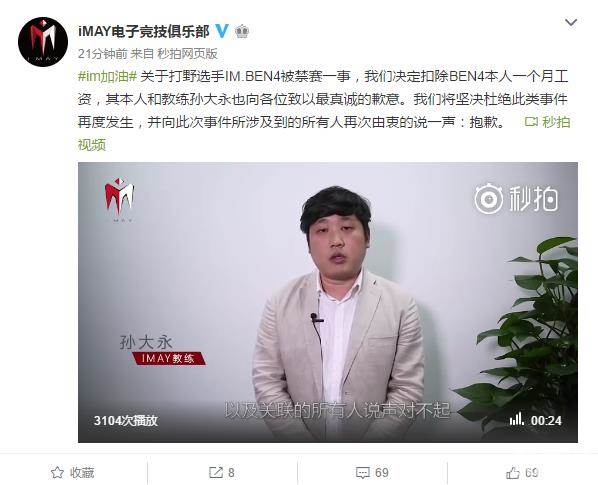 iMAY对Ben4本人处以扣除一个月工资的处罚,教练孙大永和Ben4本人出面致歉。