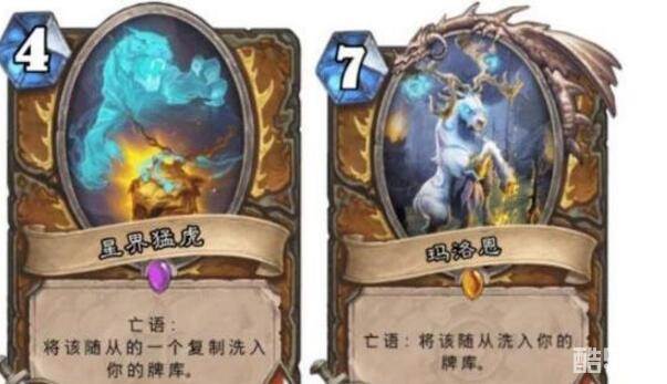 星界猛虎又称小玛洛恩,4费3-5的身材虽然比玛洛恩的7费9-7差上不少,但是乍一看相同的效果前者却多了“复制“二字,学问就藏在里头,比如直接触发亡语的话,玛洛恩就是直接被吸入牌组,而星界猛虎确实将一张复制牌洗如牌组,本体还在场上。因此星界猛虎也曾在无限墙德的体系中混的风生水起,然而好景不长,德鲁伊转眼就被削成一个弟弟。