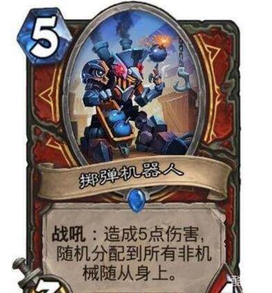 砰砰计划的一张卡,拥有非常优秀的解场能力,再加上目前为止热门卡组中带机械随从的并不多,从而能够稳定造成五点伤害,大部分展示卡组都会满编的卡,所以以出场率来讲自然也是近期死亡次数最多的战士职业随从了。