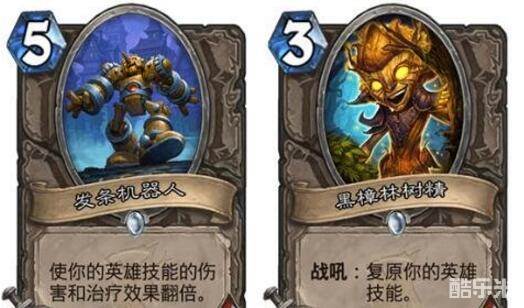 卡组中还加入了发条机器人这张卡,因为在七费你可以配合着这张随从打出六点伤害,而且这张卡在场上也是一个软嘲讽如果你不去解他他会让你吃尽苦头。而另外一张黑樟林树精虽然也是在七费的时候打出六点伤害但是由于他站在场上并没有软嘲讽的作用,所以我们选择加入发条机器人这张卡,而不是黑樟林树精。