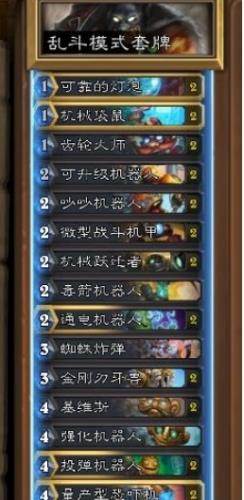 本周乱斗机械猎无敌了,5费打爆对手已是常态,先上卡组。大家可以随便换里面的机械牌,小编这个卡组也不一定是最佳配置,随便组一套5费打爆对手完事。奇利亚斯一般是用不到的,5费就打爆对手了,根本不需要回血。你所要做的就是起手留低费牌,铺场打脸就可以了。