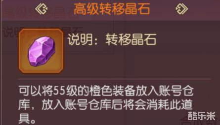 高级转移晶石可以将55级的橙色装备放入账号仓库。
