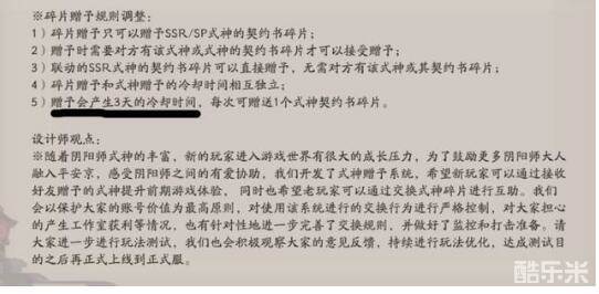 对于完整式神的赠予,一个账号这辈子只能给一只,封堵了所有工作室见缝插针的可能性。且给了完整式神有30天的冷却时间,之后再给只能给碎片了。不过值得庆幸的是联动R/SR式神可以给完整的,看来目前该游戏唯一的商机就是大量的蜜桃了。(然而老玩家依旧拿不到,所以真正占便宜的是新服玩家)