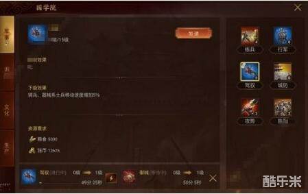 第一个影响的因素是国学院的军事科技。其中的“驾驭”和“行军”,分别可以提高骑兵、器械系士兵移动速度和步兵系士兵移动速度。所以尽可能提高“驾驭”和“行军”的科技,可以提高6大兵系的移动速度,减少移动时间。