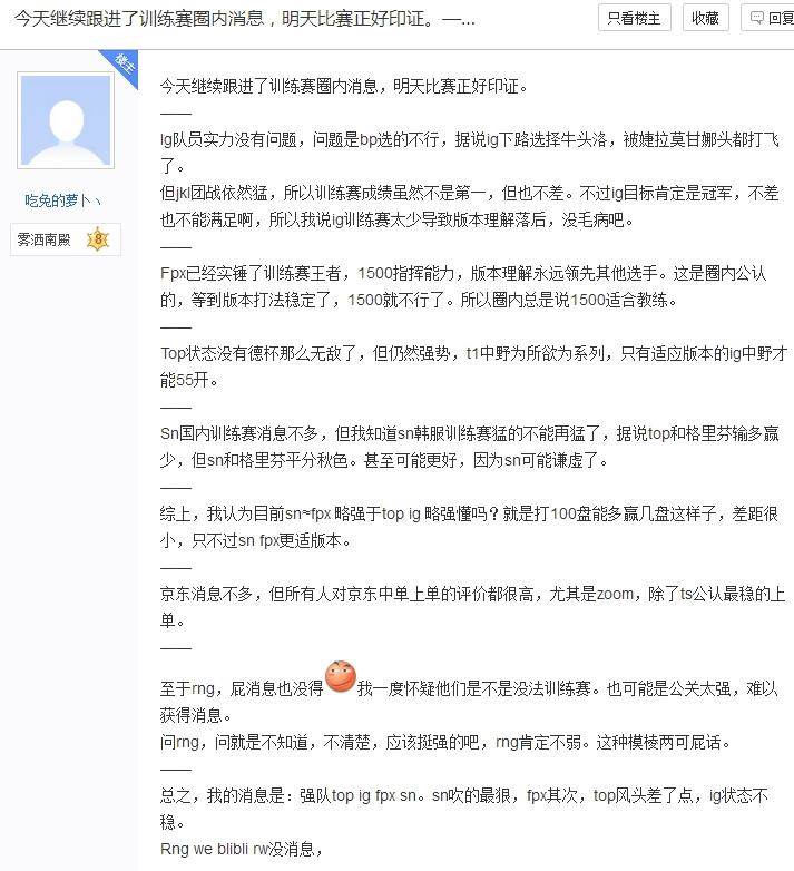 还记得上个月德玛西亚杯结束之后,有人发现抗压吧有位知情人在比赛前曾表示:训练赛的时候,TOP打IG赢多输少,并且输的都是下路被IG打爆了。没想到德玛西亚杯决赛上果真如他所说,TOP决赛不敌IG,主要是下路大劣势。于是在LPL春季赛即将开赛的前一天,这位知情人又来贴吧爆料了,这次爆料的内容是和春季赛前的训练赛有关。
