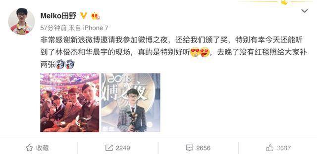 开心的不光是LOL网友们,得奖者本人也相当的开心,这不在微博之夜结束后,基本从不发微博的Meiko也是罕见的在微博上发表了动态并配上了自己现场的图片,Meiko表示“非常感谢新浪微博邀请我参加微博之夜,还给我们颁了奖,特别有幸今天还能听到了林俊杰和华晨宇的现场,真的是特别好听,去晚了没有红毯照给大家补两张。”