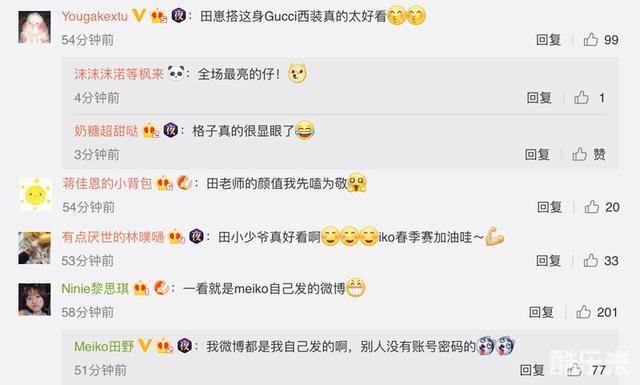 对于Meiko的这一波发声网友们也是议论纷纷,有网友表示“Meiko今天也太帅了吧,田崽搭这身Gucci西装真的太好看了,这身格子真的很显眼了,今天全场最亮的仔没毛病,说实话Meiko的颜值真的能打,完全不输那些娱乐圈的小鲜肉。”