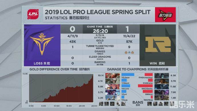 比赛的中期,RNG取得优势利用阵容分带优势牵扯V5,迅速的扩大经济领先,在24分钟,RNG有着优势轻松拿下大龙锁定胜局。