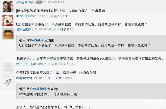 这不在看完官方的倒数第三天倒计时海报后,就有网友在论坛中聊起了这个话题,有网友表示“虽然这么说很多人不愿意听,但UZI应该是不会更强了,只会越来越捞,不如期待队友,如果队友也不行,那基本就么得了。”