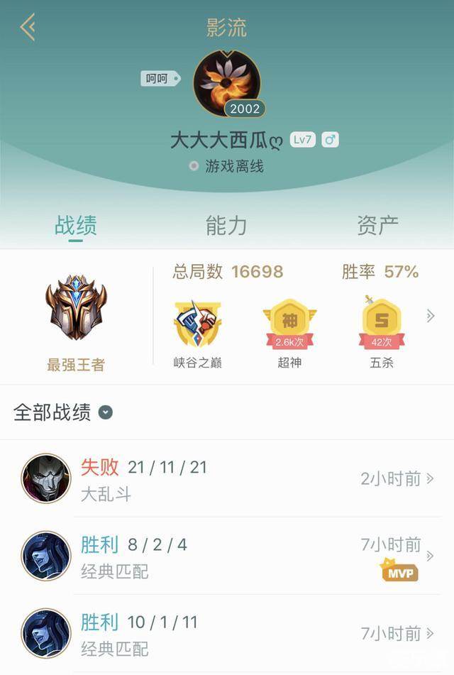 你以为这位玩家只是一个“肝帝”吗?那你就错了,他的段位还是最强王者,不是嘴 强老司机的嘴,而是名副其实的LOL最高段位“王者”!他目前一共打了16698局游戏,胜率在57%!
