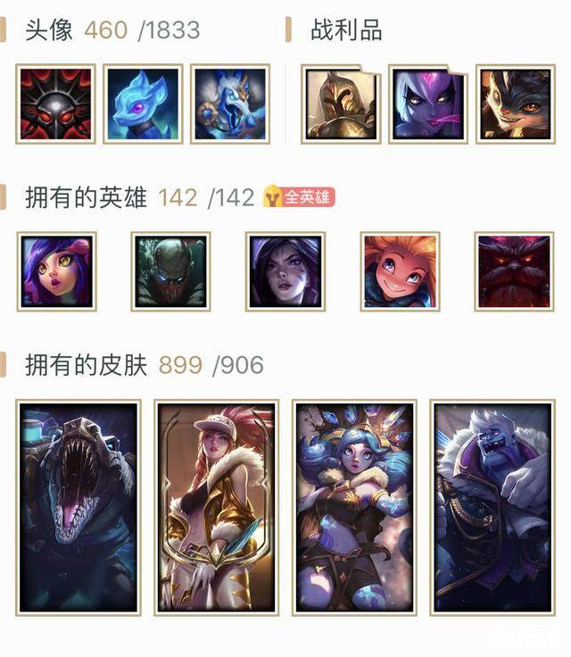 看了下他的个人资产也是666,全英雄当然就不说了,毕竟打到近2000等级送的精粹已经很多了,他的皮肤也是接近全皮肤了!!目前英雄联盟所有皮肤是906个,他就拥有了899个皮肤,不得不说这位玩家不止是“肝帝”,氪金属性也是非常强的!不知道你们怎么看呢?