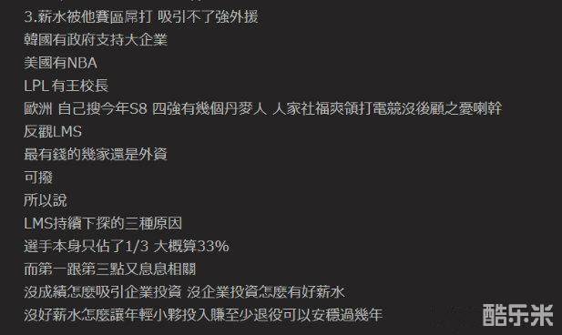 于是最近几天,在PTT论坛上,有人专门发长贴分析了为什么LMS赛区不行了,并且给出了三点原因。