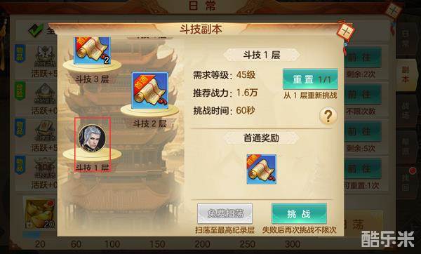 建议各位少侠每天做完其他活动提升战力之后,再挑战斗技副本的新层数,到达挑战极限才选择重置副本,这样可以最大化获得奖励哦。