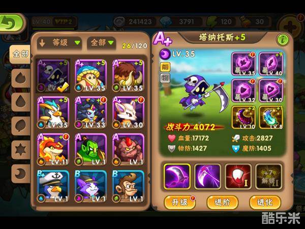 前期进化的时候最好用通用进化精灵,就是那些五角星。进化的时候最好不要相同的精灵,而是用那些星星,这样就可以把所有要培养的精灵进化到B。为什么要这么做呢?因为那些星星就是材料卡,只能用来给别的精灵进化,所以尽可能优先用。而且B品质精灵进化到B+还需要相同的精灵,这样就可以再用C级精灵进化上来,这样可以省一些刷碎片的体力。