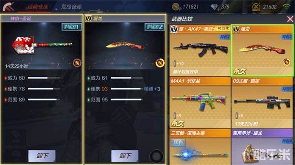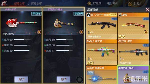 如图,铁锹-圣诞和同品质的军用手斧-耀龙相比,前者手持移速略逊于后者,但攻击范围远超后者,即:后者灵活性略占优势,而前者则是输出范围的全面碾压,可谓各有千秋。