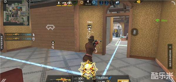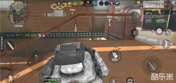 小伙伴们在靠近一些可爆破墙体或者可破坏墙体的时候一定要多多当心,因为敌人往往就会隐藏在其后准备向我们发起偷袭。如上图所示,敌人将可破坏墙壁破坏出了一排空隙区域,刚好可以用来观察楼梯口处的情况。而且位于视线的死角处,如果小伙伴们贸然前进进攻的话,有很大概率会被敌人击倒于此,抱团行动此时就无比重要了。