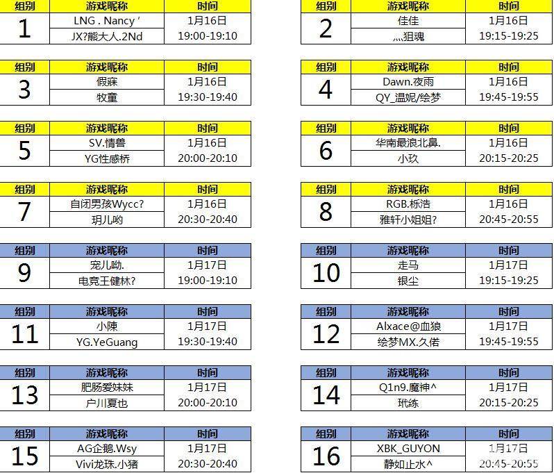 16强比赛:1月16日——19日19:00——21:00,采用BO3模式,每天2组,共分为8组。