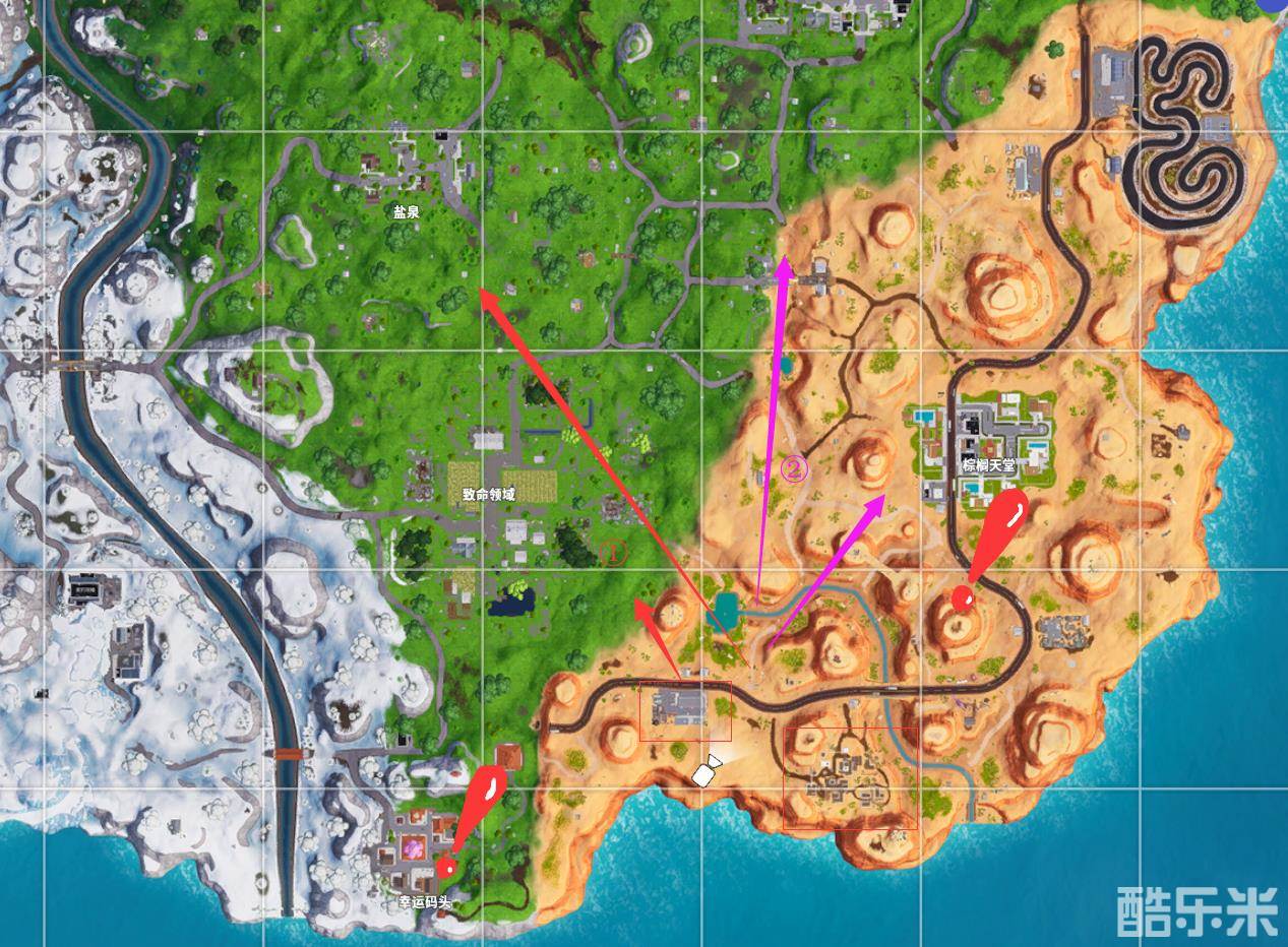 沙漠小镇在幸运码头和棕榈天堂的中间,开局落地只需要注意这两个点的人员数量,在搜索完小镇的资源后,根据开局观察的两处人员多少来确定是以红色箭头来前往致命领域并往地图中部走还是选择紫色箭头前往棕榈天堂附近并前往零售商场附近。