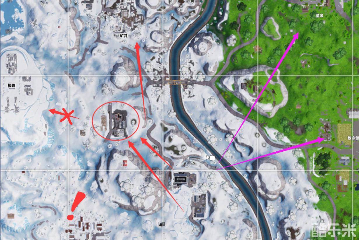 迪厅所处的位置比较左侧雪地为低点,右侧致命领域和桥为较高点。迪厅如今被雪埋了一半,四人小队资源有可能会不够分配,所以我建议在搜索完迪厅后可以按照红色箭头前往小屋再搜集,之后可以选择去嗨皮村和迪厅中间的哪一座高山观察嗨皮村的敌人动向,不建议前往极峰,因为极峰地势太高,从下面搭板而上会被敌人发现,绕路而上的话费时可能会错过前往安全区的时间,所以不建议从迪厅转移到极峰。可以选择紫色箭头前往致命领域附近再到盐泉搜索或战斗。