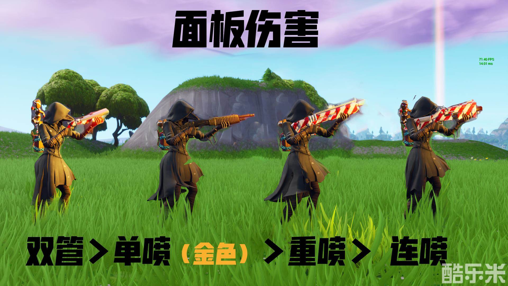 双管喷属于四种武器里面板伤害最高的霰弹枪,但是子弹量只有两发一个弹夹,对于玩家射击的精准度和时机 控制非常高,其次是金色和紫色的单喷,然后是重喷和连喷。