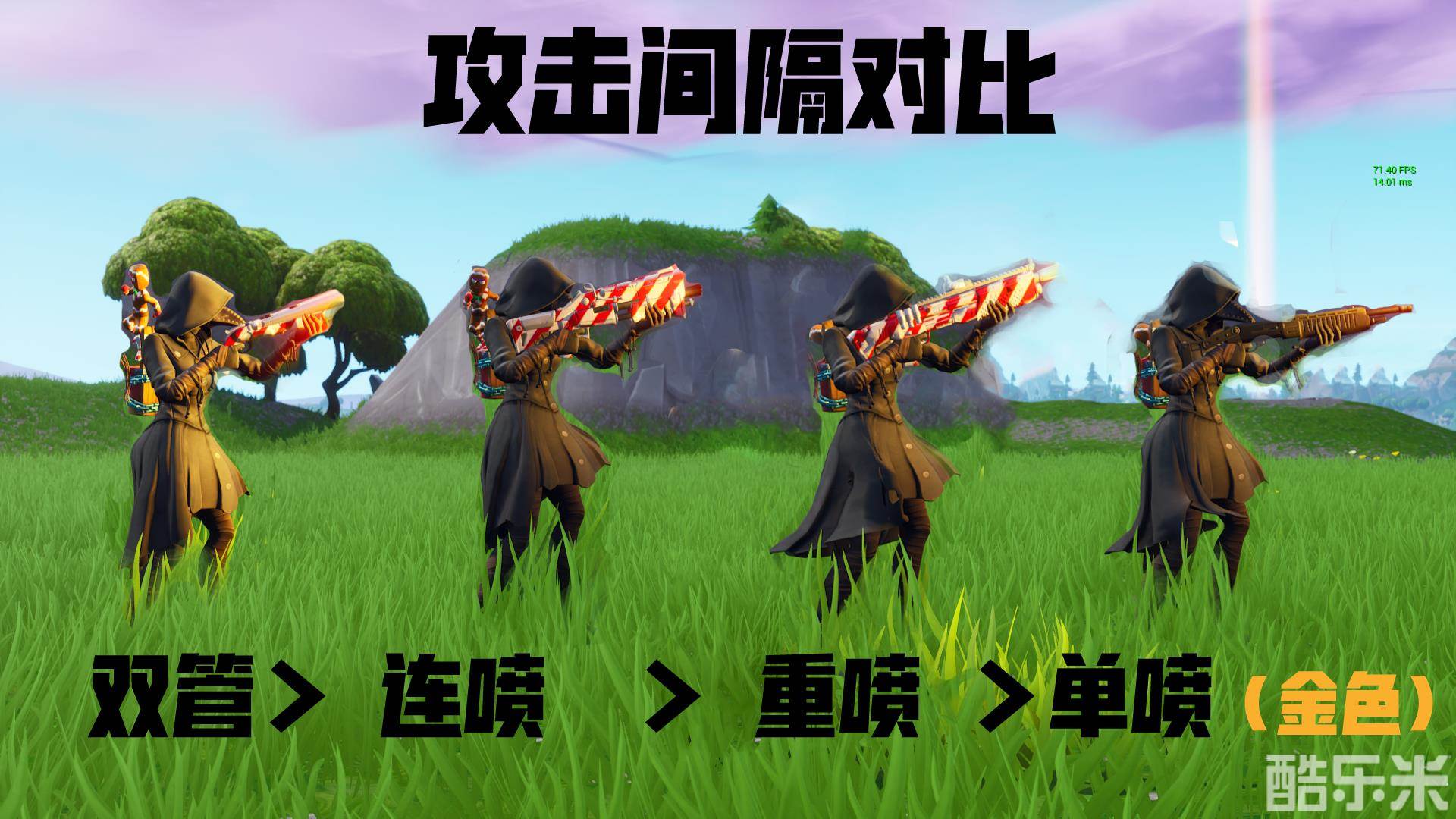 双管排在射速第一的位置是因为我以攻击间隔为基础做的排序,双管两发的间隔时间很快,我们可以抛开双管来看后三位的射速对比,连喷毋庸置疑是所有霰弹枪中射速最快的喷子,其次是重喷,重喷的攻击间隔只略低于连喷,略高于单喷。