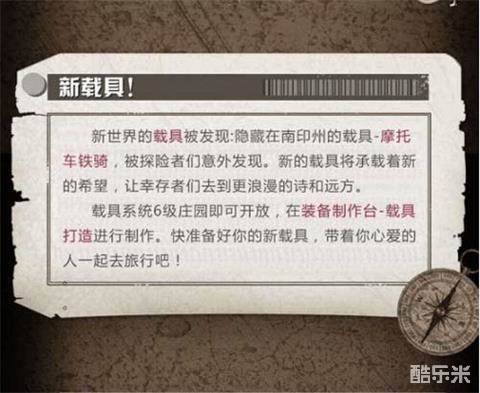 2、根据官方系统的消息,摩托车将在玩家庄园等级达到6级时开放制作。届时,玩家可在庄园装备制作台领略全新的子啊局,谋取良好的生存和作战效果。
