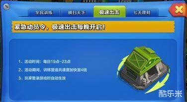 任务分析:活动时间是每晚的19点到23点,然后活动期间,训练营的造兵速度加快至4倍,并且是我们只要一登陆游戏时就会自动生效了。