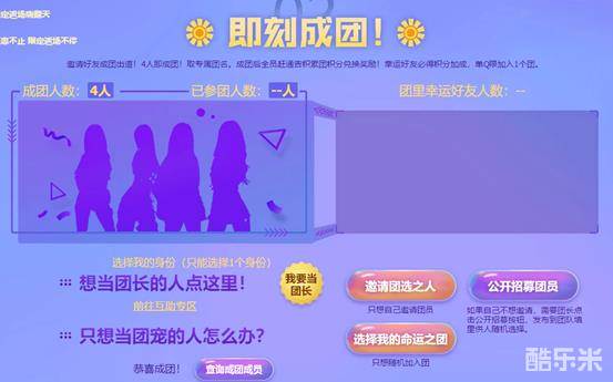玩家需先成团,才可继续任务!邀请好友成团出道,4人即成团!取专属团名,成团后全员赶通告积累团积分兑换奖励!幸运好友必得积分加成,单Q限加入1个团。