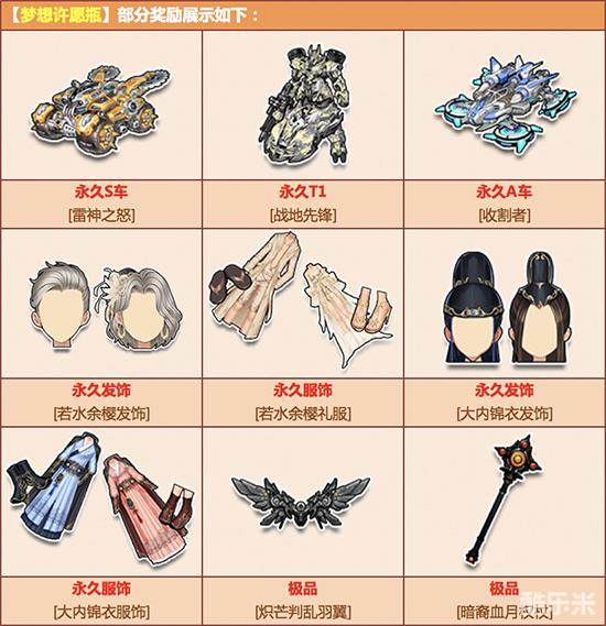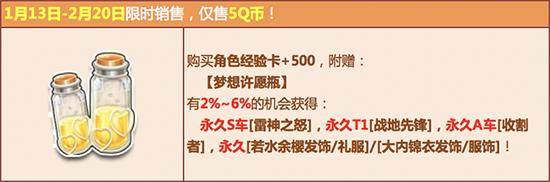 1月13日-2月20日,在飞车商城购买【角色经验卡+500】,赠送【梦想许愿瓶】,有机会得永久S车【雷神之怒】、永久T1【战地先锋】、永久A车【收割者】、永久【若水余樱发饰/礼服】/【大内锦衣发饰/服饰】或其他奖励之一!其中核心极品期限型概率范围为:4%-6%,核心奖励永久型概率范围为:2%-4%,非核心奖励概率范围为:90%-94%。