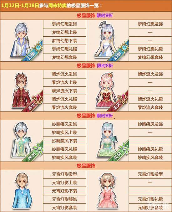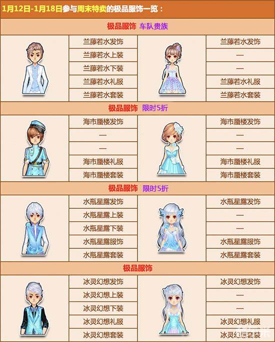 1月12日-18日期间,极品套装【兰藤若水套装】、【梦绮幻想套装】、【水瓶星露套装】、【冰灵幻想套装】等限时出售,最低5折,手快有,手慢无哦!