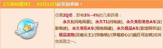1月11日起,【万能咕噜球】更新,仅需2Q币就有3%~4%的几率获得永久S【闪电风暴】、永久T1【闪电侠】、永久A车【幻影绝迹】/【银电销魂】/【影流阿尔法】、极品宠物【花楹公主】/【特鲁格】/【草莓甜心】/【疯狂可达鸭】或其他奖励之一!获得其他物品的几率为88%~92%。