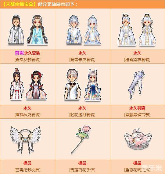 1月10日-2月16日期间,购【角色经验卡+300】,赠送天降幸福宝盒,有机会得永久首发【青岚及梦套装】、永久【桂香染衣套装】/【晴雪未央套装】/【落枫秋鸿套装】/【轻花邀月套装】或其他奖励之一!其中核心奖励期限型概率为4%-6%,核心奖励永久型概率为2%-4%,非核心奖励概率为90%-94%。