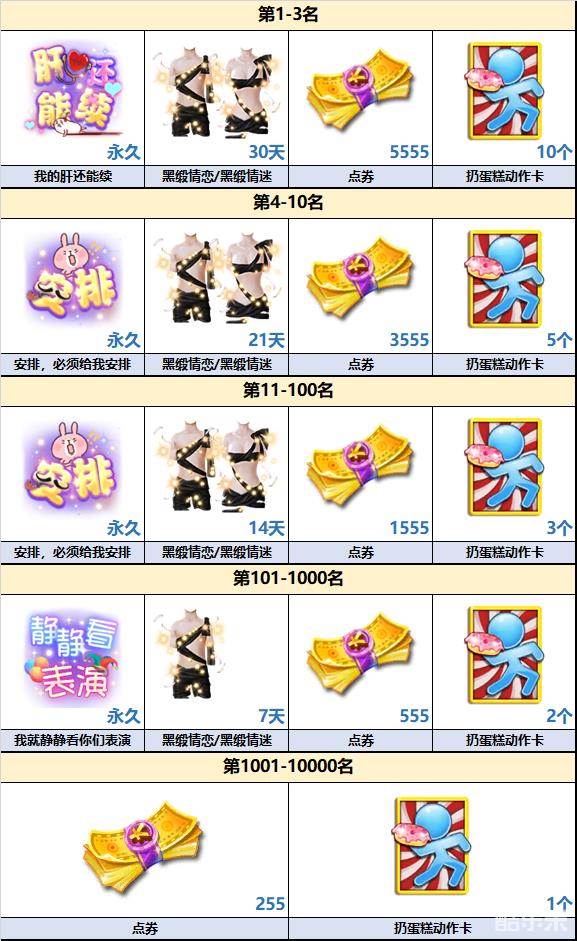 - 活动积分:用于开启阶段宝箱、积分排行榜两个部分。开启宝箱可获全套教导主任服饰,此外还有大量点券、人气道具等你打包带走。累计活动积分,可参与积分排行榜,活动结束时根据所在排名发放不同奖励,绝版高端称号、奢华黑色光效套装静待你的领取。